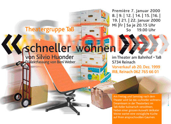 «Wenn die Qualität des Wohnens von der waschbaren Tapete, vom geräuschlosen Lichtschalter, vom Chromstahlausguss und der vollautomatischen Waschmaschine alleine abhängig wäre, so wäre das neue Wohnen eitel Wonne.» (Richard Arioli) «Endlich daheim!» mag sich Kunsthistorikprofessopr Wituschinski erlöst denken, als er mitsamt antiquarischem Hausrat und seiner Lebensgefährtin vor der neuen stattlichen Bleibe ankommt. Doch damit fangen die Probleme erst an: Der Schlüssel für die frisch renovierte Wohnung will nicht passen und während ein Gewitter aufzieht, verwandelt sich der ersehnte schnelle Wohnungswechsel in ein Desaster. «schneller wohnen» ist ein Theaterstück des Exil-Bündners Silvio Huonder. Es wurde 1996 in Berlin uraufgeführt. Beni Weber hat für die Theatergruppe eine Dialektversion verfasst. |