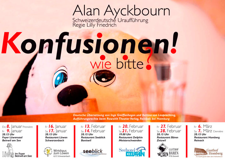 Alan Ayckbourn führt uns mit Augenzwinkern und feinem Humor in die Abgründe der Seele. Er zeigt uns Fehlschläge menschlicher Kommunikation, seziert den schrecklichen Mutterwahn, beleuchtet männliches, sinnloses Balzverhalten und die erstarrten bürgerlichen Ehemuster. Er selbst antwortet auf die Frage, was er uns mit seinen Stücken sagen will: «Ich denke, dass ich Ihnen am meisten von Ihnen selbst erzählen will oder Sie zumindest auffordern möchte, sich selbst zu befragen.»