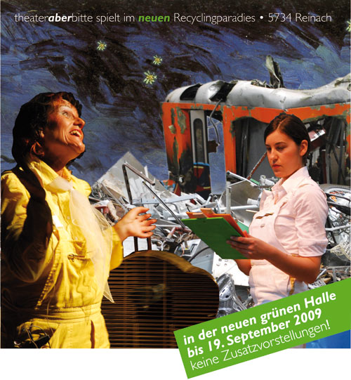 Über diesem Geschehen thronen auf dem Ölymp zwei Götter und eine Posaune spielende Göttin. Sie schliessen eine Wette ab: Schaffen es bis Mitternacht wenigstens vier Menschen, wieder in ihr richtiges Leben zurück zu finden? Mit ihren Manipulationen und Unterlassungen stürzen die Götter alles ins Chaos und die Göttin versucht zu retten, was zu retten ist. Dazwischen treiben die Komödianten ihren schlimmen und folgenreichen Schabernack und der Chor versucht, die Stimmung auf der Halde im letzten Moment zu kippen! Bei mönsche, schrott & stärne können Sie nachdenken, lachen und ungewohnte Abfallansichten sehen. Was hinter den tragikomischen Turbulenzen steht, ist letztlich die Frage. Können Menschen recycliert werden? |